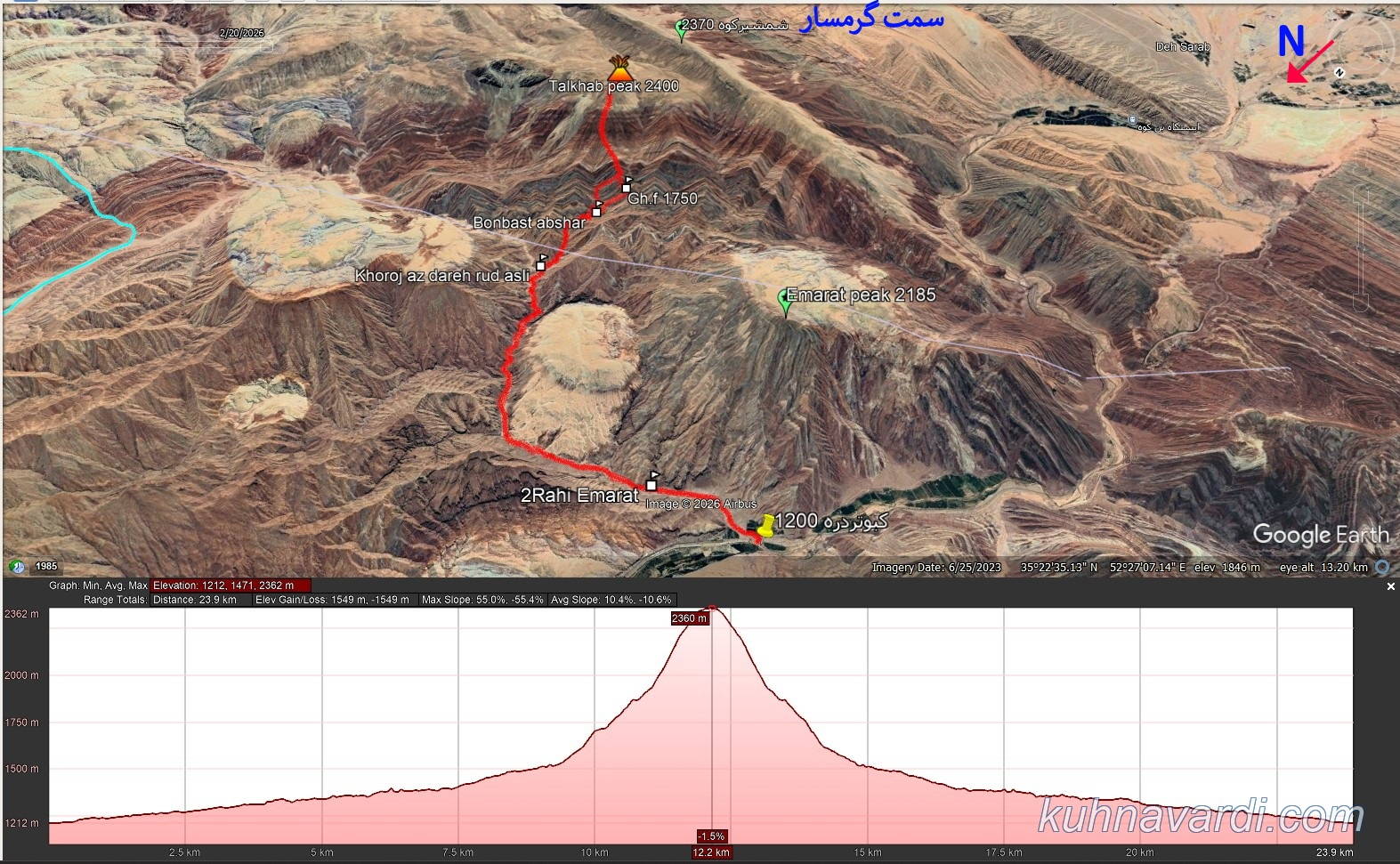 در برنامه قله عمارت (آذر ماه 1402) با توجه به زیبایی های این مسیر تصمیم گرفتم که در آینده برنامه دیگری مبنی بر صعود قله های شمشیرکوه و تلخ آب را در همین مسیر تدارک ببینم. در نتیجه ترک مسیر را در گوگل ارث ترسیم و طراحی نمودم تا امسال که فرصت اجرای این برنامه پیش آمد.
