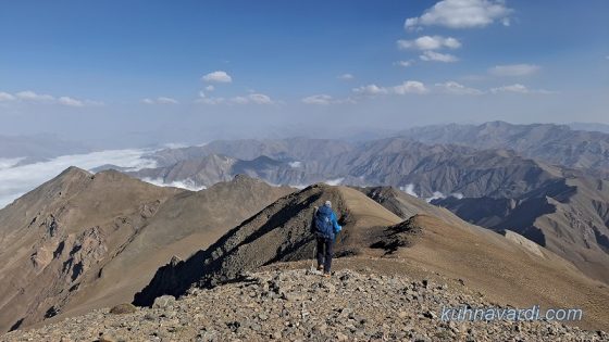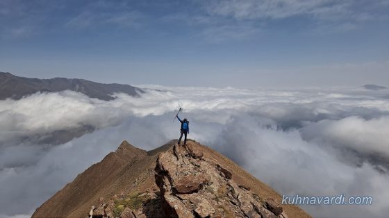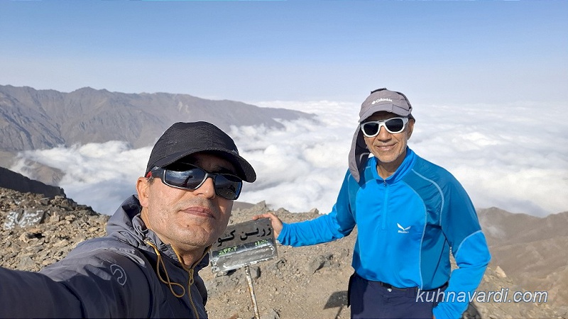 مناظر بی نظیر دریای ابر در سمت شمال همچنان چشم ها را نوازش می داد و البته باد شدیدی روی قله شروع به وزیدن کرد که هر لحظه بیشتر می شد. خیلی سریع مسیر قله زرین کوه را در پیش گرفتیم. از سه کنج تا زرین کوه مسیر حدود نیم ساعت و کاملا نرمال با شیب متوسط است. باد شدید در حدود 60 ک/س حرکت را کمی دشوار می کرد. در اینجا با خودم فکر کردم که اگر در مسیر سه کنج روی سنگ ها چنین بادی می وزید چقدر سخت و شاید خطرناک می شد! در نهایت پس از حدود 8.5 ساعت تلاش، ساعت 15:20 به قله زرین کوه در ارتفاع 4185 متر رسیدیم.